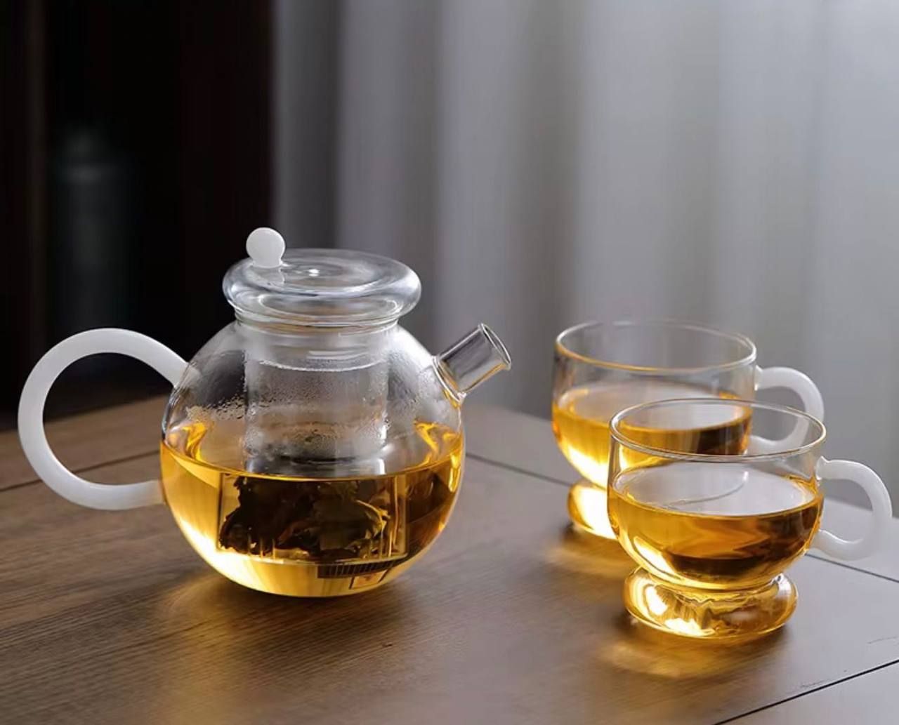 В набор входит прозрачный стеклянный чайник с белой ручкой и две прозрачные кружки с белой ручкой